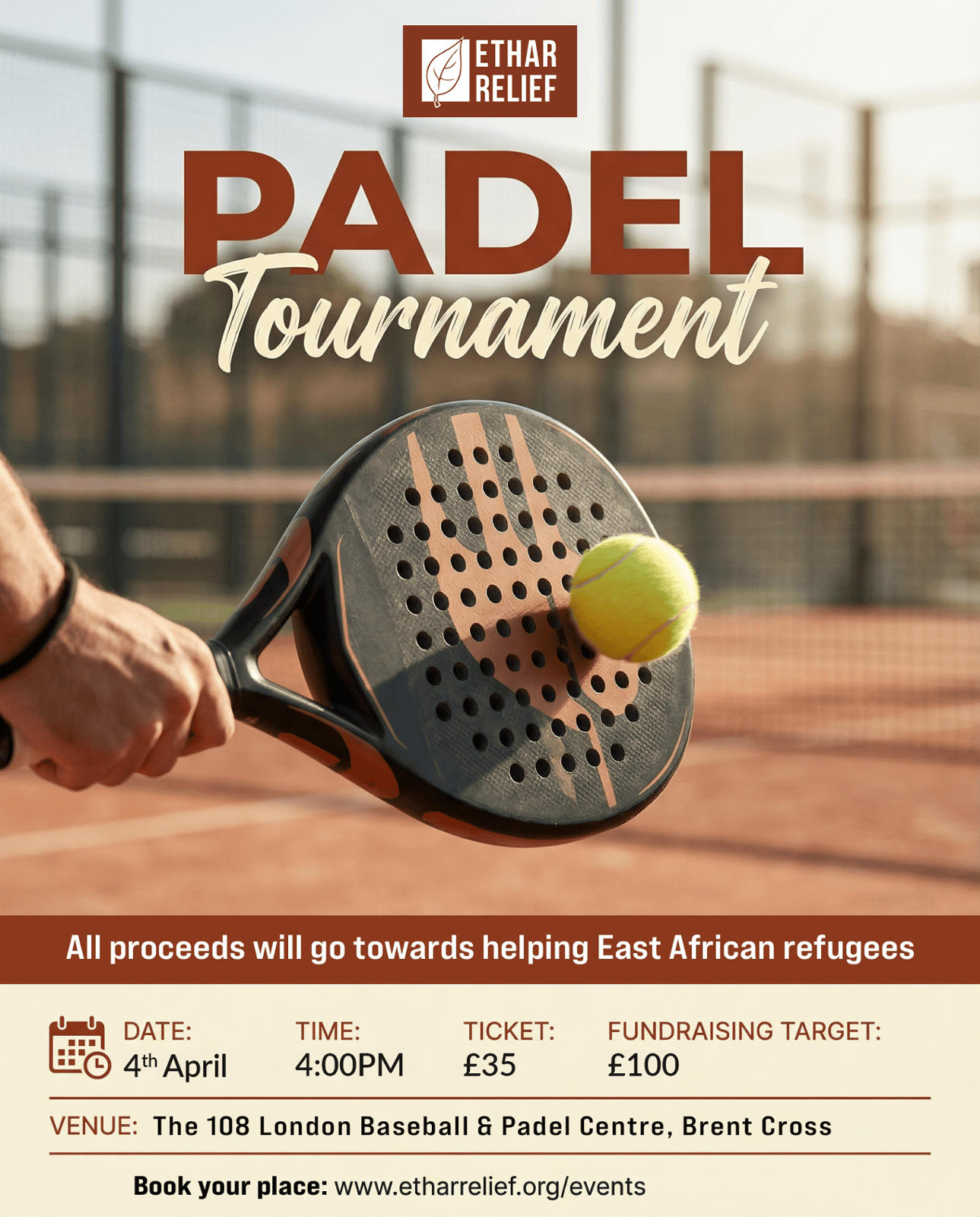 This competitive yet friendly tournament will bring players together for an evening of high-energy padel while raising vital funds to support East African refugees. Every rally, point, and win contributes directly to life-saving humanitarian work.