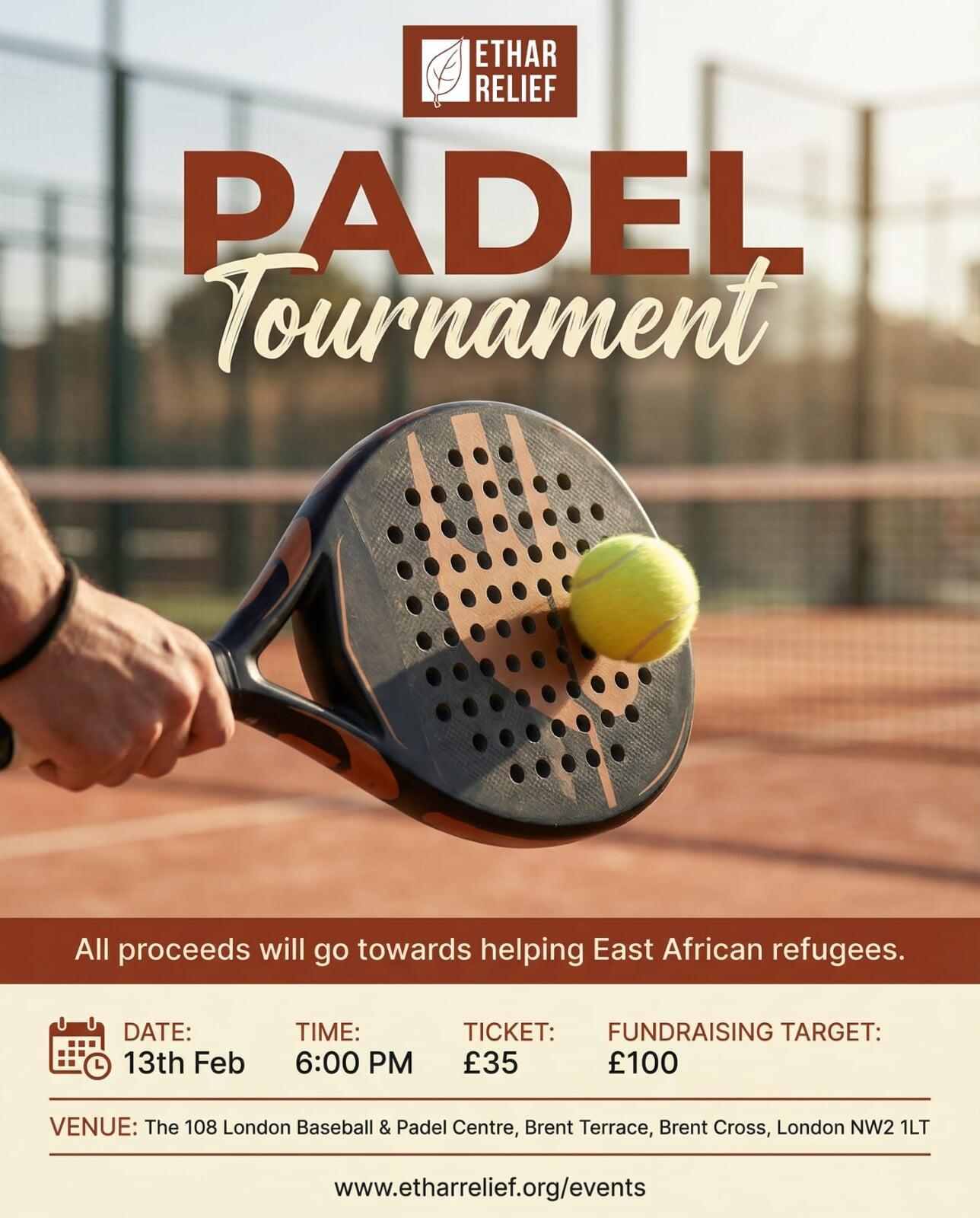 This competitive yet friendly tournament will bring players together for an evening of high-energy padel while raising vital funds to support East African refugees. Every rally, point, and win contributes directly to life-saving humanitarian work.